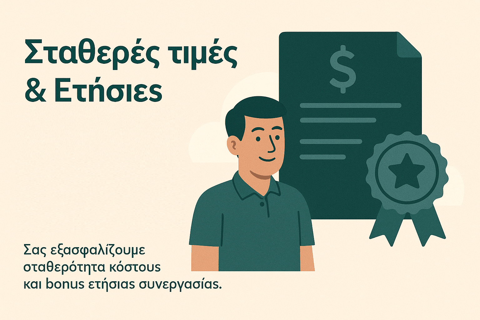 Σας εξασφαλίζουμε σταθερότητα κόστους, εγγύηση σταθερής τιμής και bonus έκπτωση στο τέλος κάθε έτους.